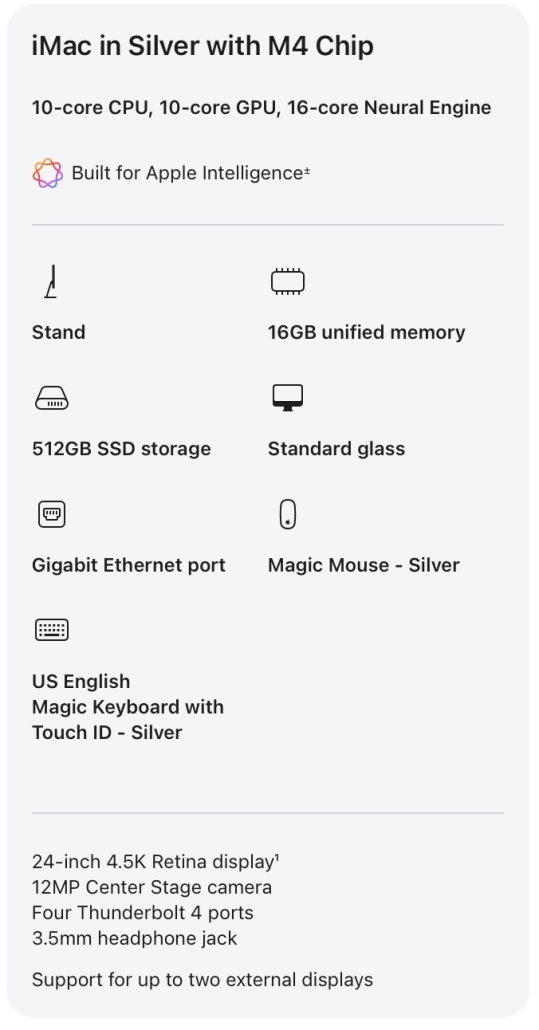 iMac M4 10 Core 16GB Unified Memory 512GB SSD, 4 Thunderbolt Ports