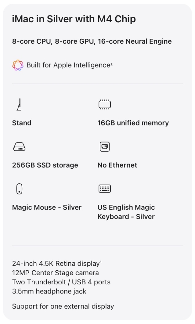 iMac M4 8 Core 16GB Unified Memory 256GB SSD,